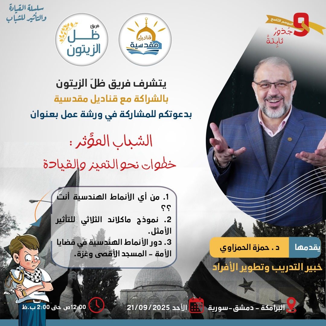 عقدت قناديل مقدسية بالتعاون مع فريق ظل الزيتون، الورشة الرابعة من سلسلة القيادة والتأثير للشباب، في العاصمة السورية دمشق، اليوم الأحد 21 آيلول/سبتمبر 2025.